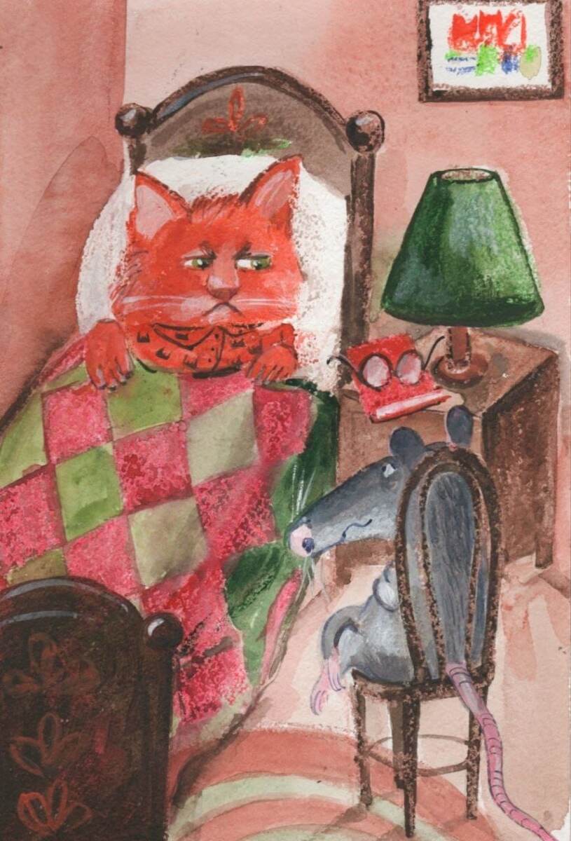 У кота Мяши любимый месяц был март: солнце уже совсем по-весеннему начинало светить, прилетали птицы, таял снег. Мяше снился очень солнечный сон, и вдруг как-то внезапно он проснулся, что- то было не так в его комнате. И это «ни так» было огромной чёрной крысой. -Доброй день,- сказала крыса,- как Вам спалось? Меня пригласила хозяйка. Мяша не знал, что сказать, он впопыхах сбежал вниз и наткнулся на Ворю. -Откуда в доме крыса? -Его зовут Объедка. Он постучался и сказал, что он остался без дома, и попросился переночевать. -Но это же крыса! -Не злись, Мяша. Мы должны всем помогать. В ту же самую секунду по ступенькам сбежал лис Нежка. -Что это такое? В моей комнате крыса. А я даже их не ем. -Это Объедка и его пригласила Воря! -Нет, это не Объедка, это Обглодка. И его никто не приглашал! -Это мой брат. Разрешите ему тоже пожить у вас. Он хороший, -сказал внезапно появившийся Объедка. Завтрак прошёл очень натянуто: Воря пыталась угодить гостям, Лис просто дулся и готов был плюнуть крысам в