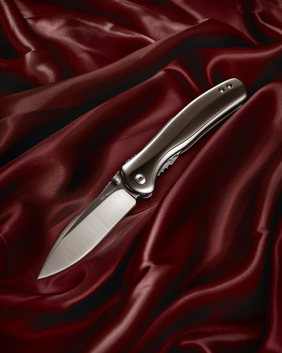 Создано на основе запроса: folding knife rests on a silk surface, in folds of wine red silk, soft dramatic lighting, cinematic close-up