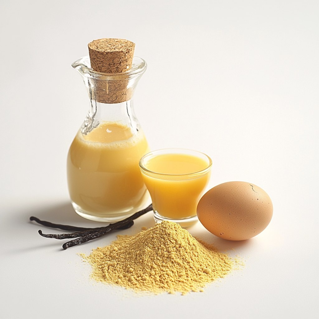 Создано на основе запроса: A digital photograph featuring Advocaat flavoring in a glass bottle with a cork and a small glass cup filled with a creamy golden-yellow liquid. In the foreground, a small heap of golden powder represents powdered flavoring. Next to it, a fresh egg and a vanilla bean pod are artfully arranged. Clean white background, soft studio lighting, styled like a product catalog photo. Isolated, white background