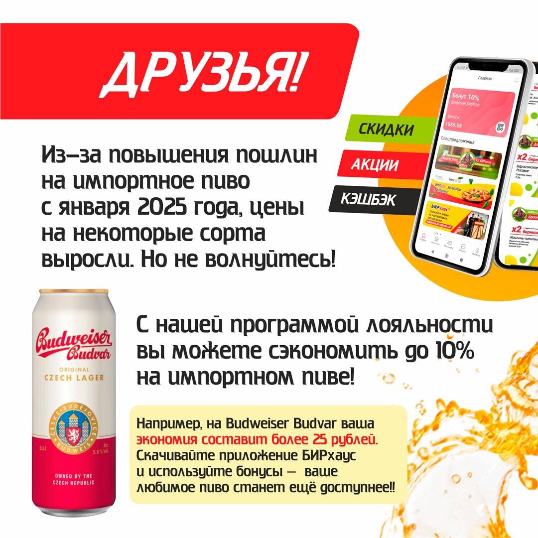 Друзья! Из-за повышения пошлин на импортное пиво с января 2025 года, цены на некоторые сорта выросли. Но не волнуйтесь! С нашей программой лояльности вы можете сэкономить до 10% на импортном пиве! Например, на Budweiser Budvar ваша экономия составит более 25 рублей. Скачивайте приложение БИРхаус и используйте бонусы – ваше любимое пиво станет ещё доступнее! Ссылки на наше приложение ⬇️ 👉 ДЛЯ Android play.google.com/store/apps..... 👉ДЛЯ IOS clck.ru/38aA9R #Сибирь #Омск #omsk #jvcr #Омскаяобласть #регион55 #крафтовоепиво #бирхаус #пенное_Бирхаус #пиво #beer