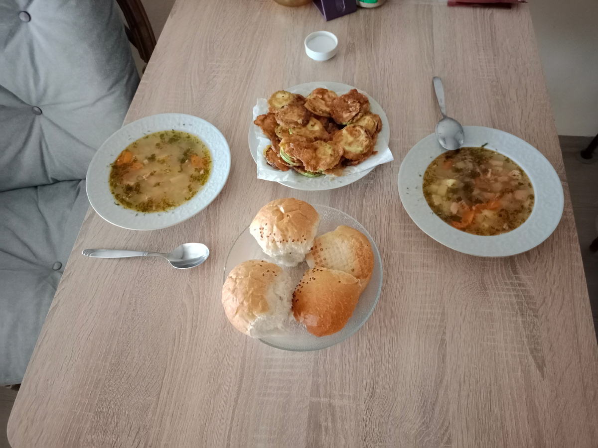 Всем доброго времени суток 👋😉 У нас вторник 22.04.2025 г. Мой муж пригласил меня прогуляться в тц МаркАнталья !! Но когда есть цель гулять же веселее поэтому я быстро сориентировалась и решила, что мне нужна Обнова в виде летних штанишек)) Решено было идти после обеда, чтоб запахи фудкорта не отвлекали от шопинга и зыринга. Обед наш состоял из ухи с форелью (приготовленной мною) и молодыми кабачкам обвалеными в кляре и обжаренные ( приготовленными Александром) Ну собственно я приготовила кляр и придала форму кабачкам, а он стоял и методично макал их в кляр и обжаривал, а я в это время занималась своими мелкими интересными делишками)) А ещё были остатки хлеба (вчерашней ромашки) мы его не весь вчера съели хоть и весит он 210 гр. На хлеб я вовсе не налегаю , а красота наросла после родов и с возрастом прибавилась ТК муж на руках носит и мало хожу пешком 😉💃 Потом мы стали собираться , одеваться , я решила надеть из украшений свой единственный серебряный комплект (потому что предпочита
