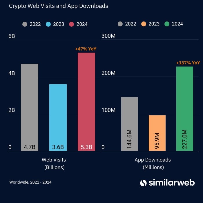 🔸Similarweb: Активность на криптовалютном рынке в регионе EMEA (Европа, Ближний Восток, Африка) растёт. После спада в 2023 году, 2024-й отметился резким восстановлением — особенно за счёт роста использования мобильных приложений