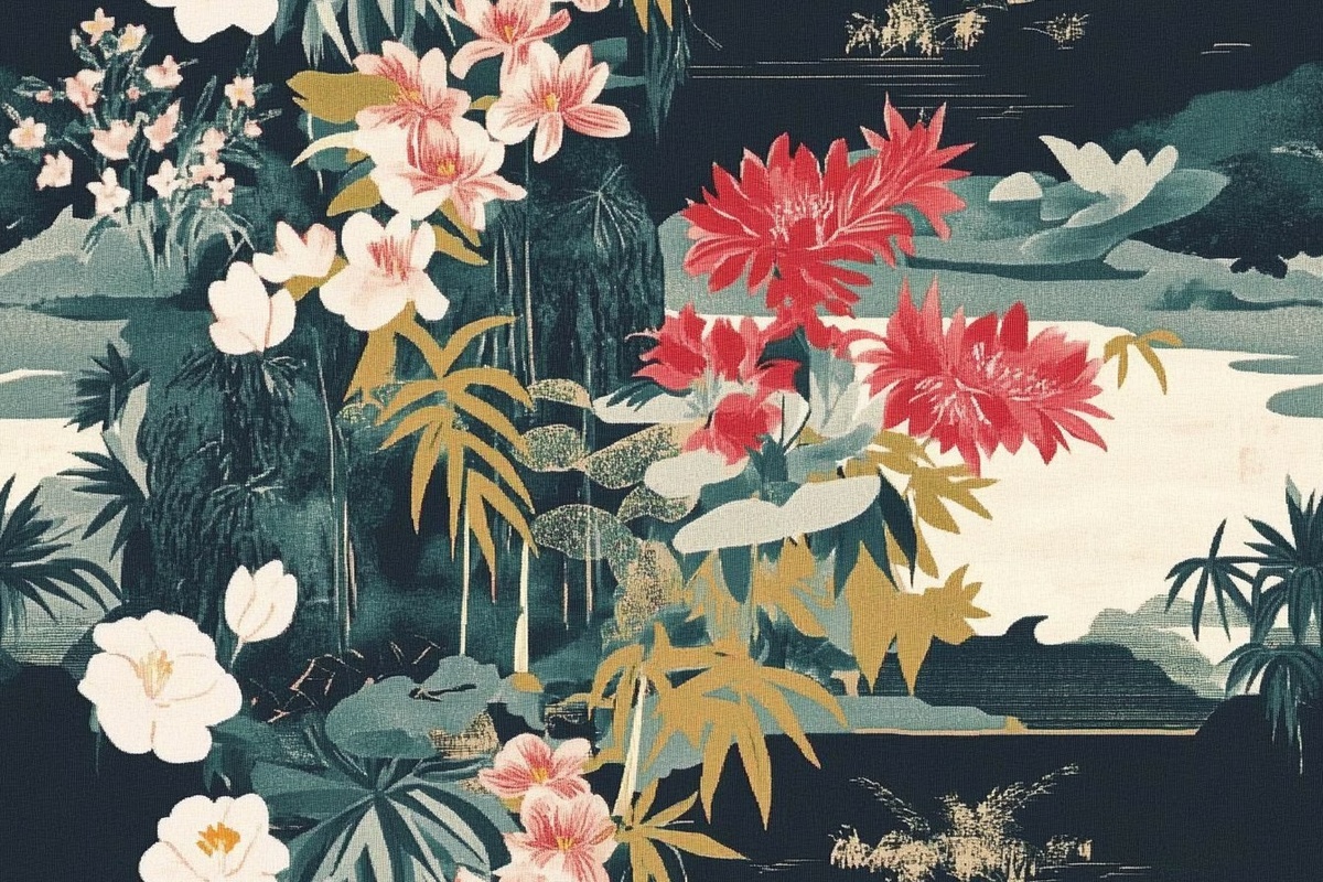 Создано на основе запроса: design and create seamless repeat pattern south east asian scenery and botanical inspired by --- Автоперевод: проектируйте и создайте плавный повторный рисунок юго -восточной азиатской пейзажи и ботанический вдохновлен Хорошо вышло? 🤔 https://dzen.ru/id/65c0c65c86e4f837c27b24d7 #ИИ #AI #нейросеть #midjourney #art