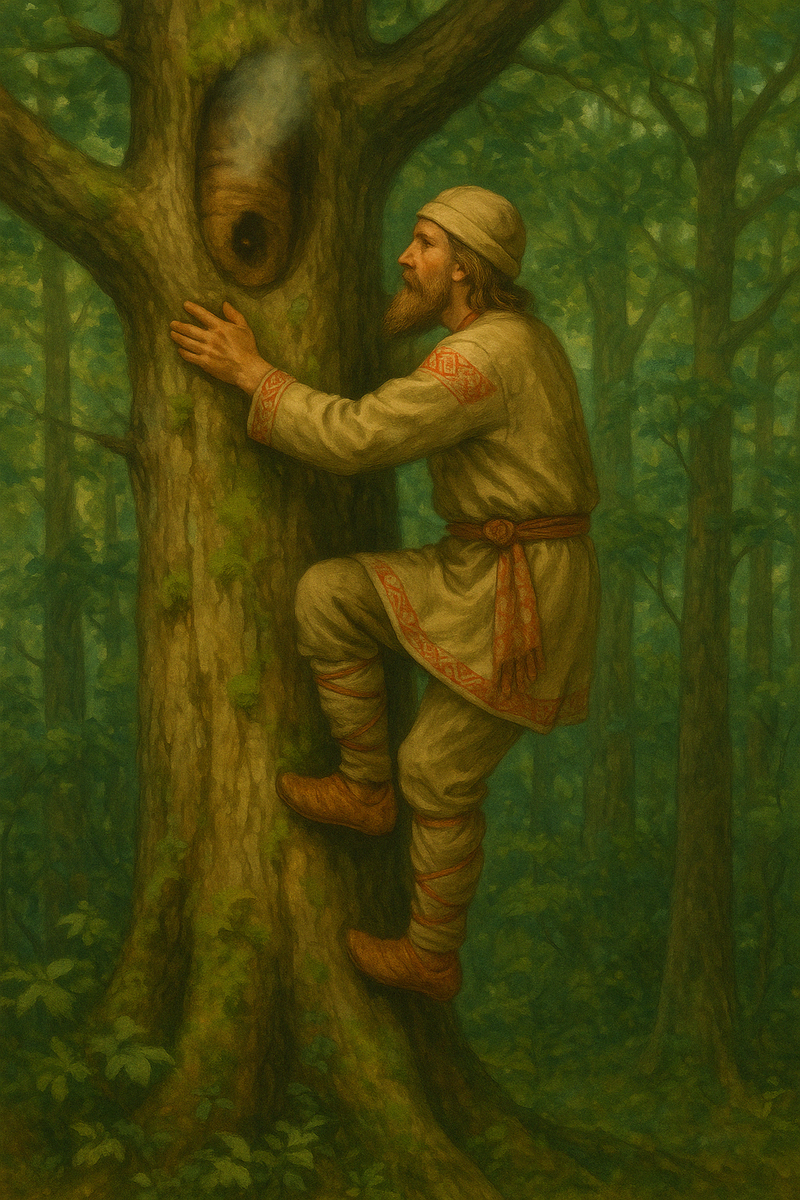 Смоленская земля с её густыми лесами и нетронутыми чащами с древности славилась мёдом. Здесь, среди дубов и лип, занимались бортничеством — древним способом добычи мёда диких пчёл. Для кривичей это был не просто промысел, а целый образ жизни, связанный с лесом, духами и природными циклами. Бортничество — это разведение и содержание диких пчёл в естественных или выдолбленных дуплах, называемых бортями. В отличие от современных пасек, борти устраивали прямо в деревьях — чаще всего в старых соснах, дубах или липах. Такие деревья называли «бортными» и относились к ним с почтением. Бортник — это мастер и лесной мудрец. Он знал повадки пчёл, умел лазать по деревьям, беречь их и собирать мёд, не разрушая жилище роя. На пояс вешали специальный топорик — бортничий, а к ногам привязывали петли из лыка, чтобы карабкаться по стволу. Мед собирали лишь раз в год, обычно в конце лета, перед Спасами. Перед сбором всегда произносили заговор или молитву — чтобы пчёлы не рассердились, а духи леса не обид