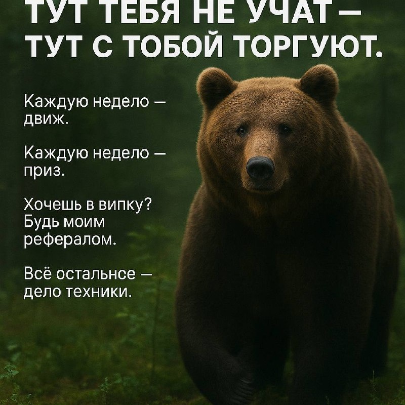 Тут не продают мечты. Тут показывают, как забирать своё. Есть випка. Закрытая. Бесплатная. Туда не купишь проход — туда заслуживают. Рефка, депозит от $100, и объём хотя бы 20к в месяц. Всё. Ты с нами. Но не думай, что это просто чат. Это сообщество тех, кто хочет брать от рынка по максимуму. Здесь никто не сидит сложа руки. Каждый сетап — как хирургия. Каждый вход — с пониманием. Каждый тейк — с уважением к риску. И чтобы подогреть интерес, у нас идут еженедельные конкурсы. Торгуешь — и можешь просто так забрать деньги. Да, реально. Без всяких "выложи скрин", "подпишись и сделай рилс". Просто торгуешь по уму — и участвуешь. Именно так выглядит здоровая трейдинг-тусовка. Где не меряются лотами, а растут. Где можно спросить — и получишь ответ. Где каждый понимает: тут свой путь, но не в одиночку. Если ты не в теме — подумай, почему. Если чувствуешь, что пора — залетай. Торгую на 🔀BingX 📱Канал 🎞YouTube 👍Отзывы 🐻Личка-VIP 📓Дзен 💬ЧАТ
