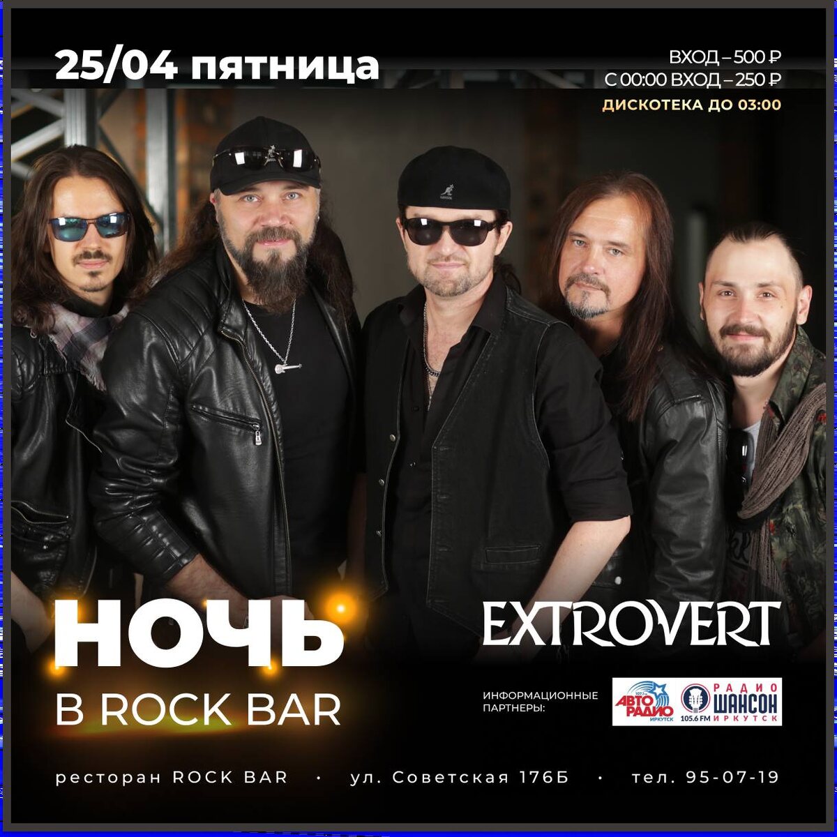 25.04 ПТ. "НОЧЬ В ROCK BAR” ГРУППА EXTROVERT & ДИСКОТЕКА. Драйвовая "НОЧЬ” пятницы - на сцене рок-группа EXTROVERT ! Всех нас ждут любимые мировые рок-хиты в профессиональном исполнении, а в продолжении концерта - дискотека под музыку всех стилей и времен! Вход 500₽, с 00:00 - 250₽ ✅ Уважаемые гости! Бронирование столиков на "Ночь в Rock Bar” проводится на время не позднее 22:00. Пожалуйста, если Вы опаздываете, позвоните или напишите нам, при опоздании более 15 минут без предупреждения бронь снимается. А/С 18+ FC/DC Данная публикация носит исключительно информационный характер. 📞INFO/RV (с 15:00) +7-9148-95-07-19 💻 INFO/RV: www.rockbar38.ru 📍г.Иркутск, ул. Советская 176Б