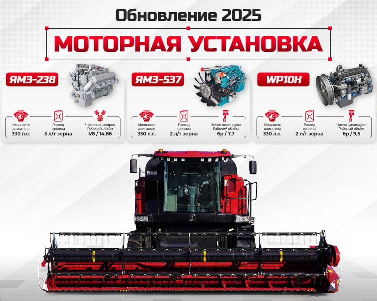 В 2025 году модель зерноуборочного комбайна GOMSELMASH GS12A1 получила важное обновление, касающееся моторной установки. Теперь сельхозтоваропроизводители могут выбирать не только проверенный временем двигатель ЯМЗ-238, но и новые 6-цилиндровые двигатели, которые открывают возможность для повышения производительности. Новые двигатели – новые возможности ЯМЗ-537 с рабочим объёмом 7,7 литра существенно улучшает экономичность, обеспечивая более низкий расход топлива при высокой мощности (в комплектации PRO). Weichai WP10H с объёмом 9,5 литра обеспечивает надёжную работу на больших площадях и значительно увеличивает эффективность уборки благодаря низкому расходу топлива (в комплектации PROFI). Надёжность и топливо Выбор подходящего двигателя критически важен для оптимизации работы на полях, так как он напрямую влияет на производительность и затраты на топливо. Двигатель ЯМЗ-238 допускает использование топлива более низкого качества, что может быть удобным в некоторых ситуациях. В то же вре