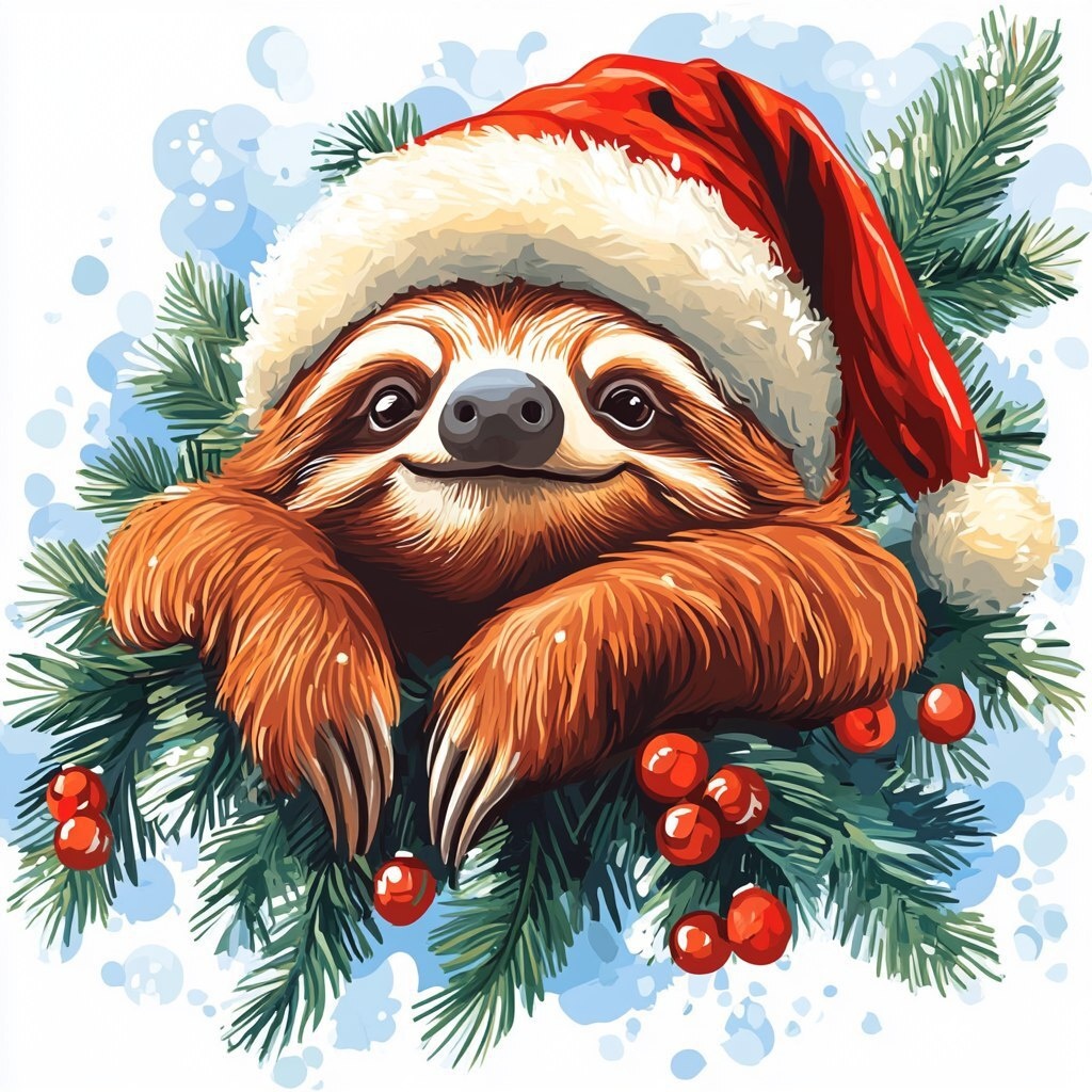 Создано на основе запроса: wery lazy sloth in a New Year's hat lying on christmass tree branch