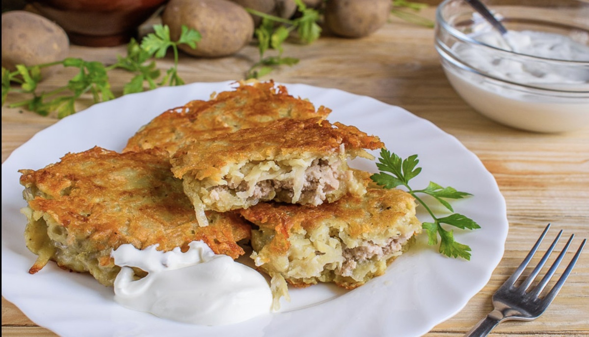 ### Ингредиенты: - Картофель – 1 кг - Мясо (свинина или курица) – 300 г - Лук – 1 шт. - Яйцо – 1 шт. - Мука – 2-3 ст. ложки - Соль – по вкусу - Перец – по вкусу - Растительное масло – для жарки ### Приготовление: 1. **Подготовка мяса:** - Мясо промойте, нарежьте на небольшие кусочки и отварите до готовности. После этого охладите и измельчите в мясорубке или блендере. 2. **Подготовка овощей:** - Очистите картофель и лук. Натрите картофель на крупной терке, а лук – на мелкой. Можно также использовать блендер для измельчения, но лучше оставить текстуру. 3. **Смешивание ингредиентов:** - В глубокой миске смешайте натертый картофель, лук, готовое мясо, яйцо, муку, соль и перец. Хорошо перемешайте до получения однородной массы. 4. **Разогрев масла:** - На сковороде разогрейте растительное масло на среднем огне. 5. **Формирование и жарка дерунов:** - С помощью ложки или руками сформируйте из картофельной массы небольшие лепешки и осторожно выложите их на разогретую ск