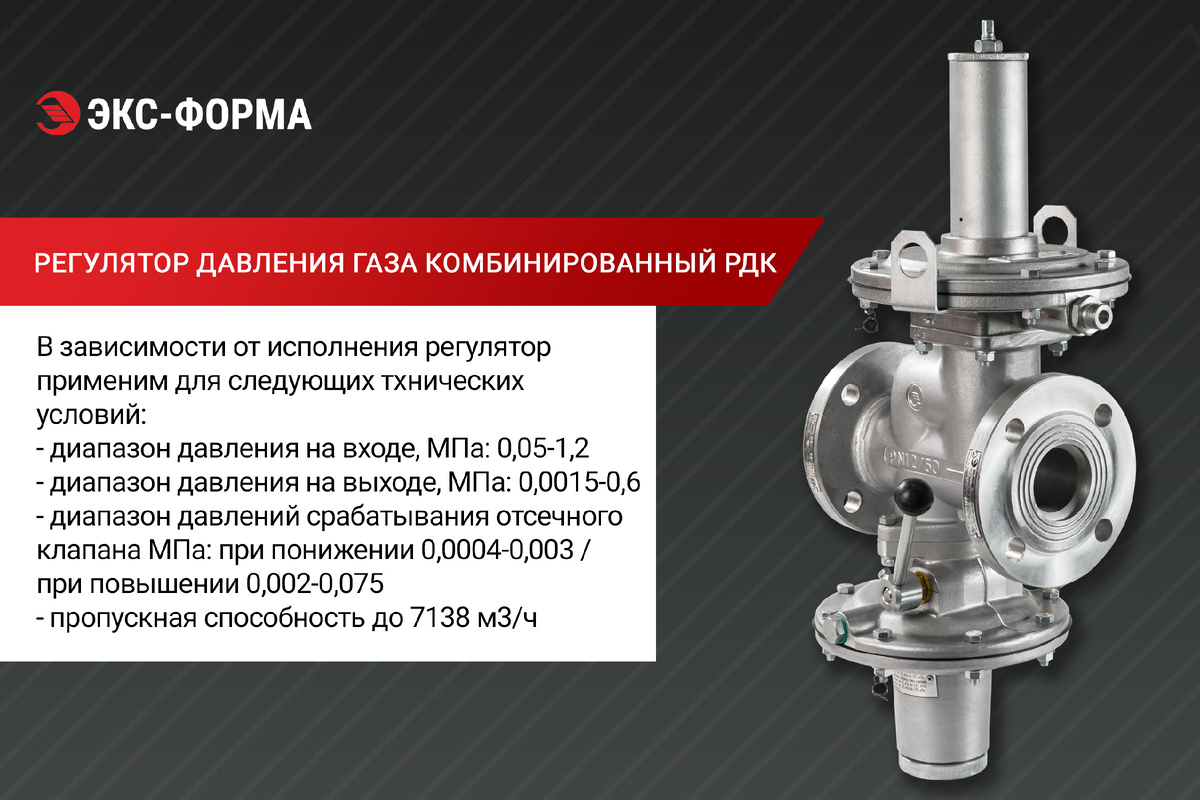 Мы представляем вам регуляторы давления газа комбинированные РДК, которые отлично подойдут для решения задач, связанных с редуцированием давления газа и автоматическим поддержанием выходного давления в заданных пределах независимо от изменения входного давления и расхода газа. Почему именно РДК? Не упустите возможность повысить эффективность и безопасность своих газовых систем! Свяжитесь с нами уже сегодня для получения дополнительных подробностей и консультаций: ссылка на сайт Сделайте шаг к надежной и стабильной работе вашего оборудования с регуляторами давления газа РДК от ООО ПКФ "Экс-Форма"!