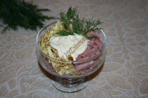 Салат «Блинный» От автора: Салат «Блинный» содержит мало ингредиентов, но данное сочетание придет ему отличный вкус. Сложно сказать про калорийность салата, но думаю она в нем на высоте. Ингредиенты: Яйцо - 8 шт. Колбаса копченая - 250 гр. Чеснок - 5 зуб. Майонез - 100 гр. Источник: https://rusdinner.ru/page/salat-blinnyj