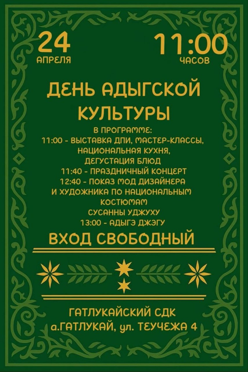 Дорогие друзья! 🎉Приглашаем вас на яркое событие – празднование Дня адыгской культуры! 📅 Дата: 24 апреля 2025 года 🏛 Место: Гатлукайский СДК (а. Гатлукай, ул. Теучежа, 4) Программа праздника: ✨ 11:00 – Выставка декоративно-прикладного искусства, мастер-классы , Национальная кухня, дегустация блюд 🎭 11:40– Праздничный концерт 🎉12:40- Показ мод дизайнера и художника по национальным костюмам Сусанны Уджуху 💃 13:00 – Адыгэ джэгу Вход свободный! Приходите сами и приводите друзей – вместе мы сохраняем и преумножаем культурное наследие нашего народа!