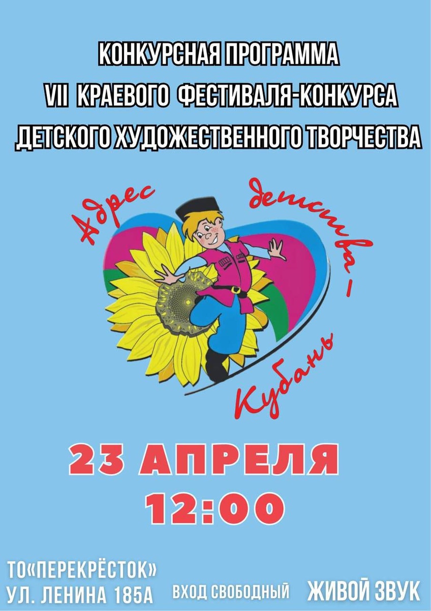 ТО "Перекресток" приглашает на 7-й краевой фестиваль-конкурс детского художественного творчества «Адрес детства - Кубань!»! 🎨✨