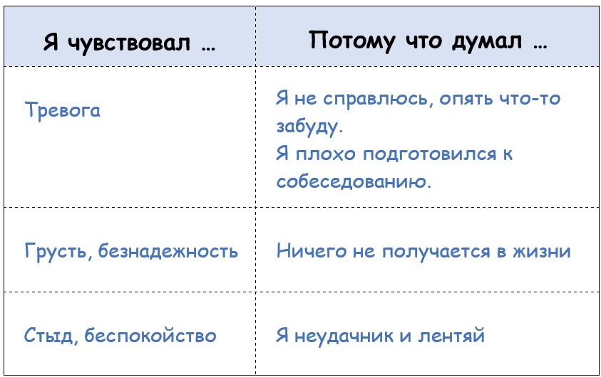 Посвятите этому занятию хотя бы 10 минут в день, сделайте хотя бы 3 записи за день. Так вы сможете увидеть, какие автоматические мысли повещают вашу голову чаще всего и какие эмоции они в вас вызывают. Особенно важно отследить эти мысли в те моменты, когда вы чувствуете себя уязвимо – вам грустно, вам не хочется ничего делать, вам страшно, одиноко, вы чувствуете беспомощность, тревогу, злость и т.д.