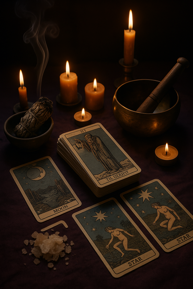 Мир Таро — это не только карты и значения. Это древняя система, наполненная символизмом, энергетикой и глубоким внутренним смыслом. Для тех, кто работает с Таро не просто как с инструментом гадания, а как с путеводителем по жизни, ритуалы и практики становятся важной частью взаимодействия с колодой. Ритуалы — это своего рода мост между обыденностью и сакральным пространством. Они помогают: Правильный ритуал делает расклад не просто предсказанием, а глубокой внутренней работой. Прежде чем приступить к практике, колоду необходимо очистить — особенно если она новая или долго не использовалась. Способы: Перед раскладом важно успокоить ум и настроиться на работу. Простая техника: Некоторые тарологи создают энергетический круг защиты — особенно при работе с клиентами. Как это сделать: Выберите одну карту и сосредоточьтесь на ней. Посмотрите на изображение, закройте глаза и «войдите» в её мир. Задайте себе вопросы: Эта практика помогает развивать интуицию и ассоциативное мышление. Ведите