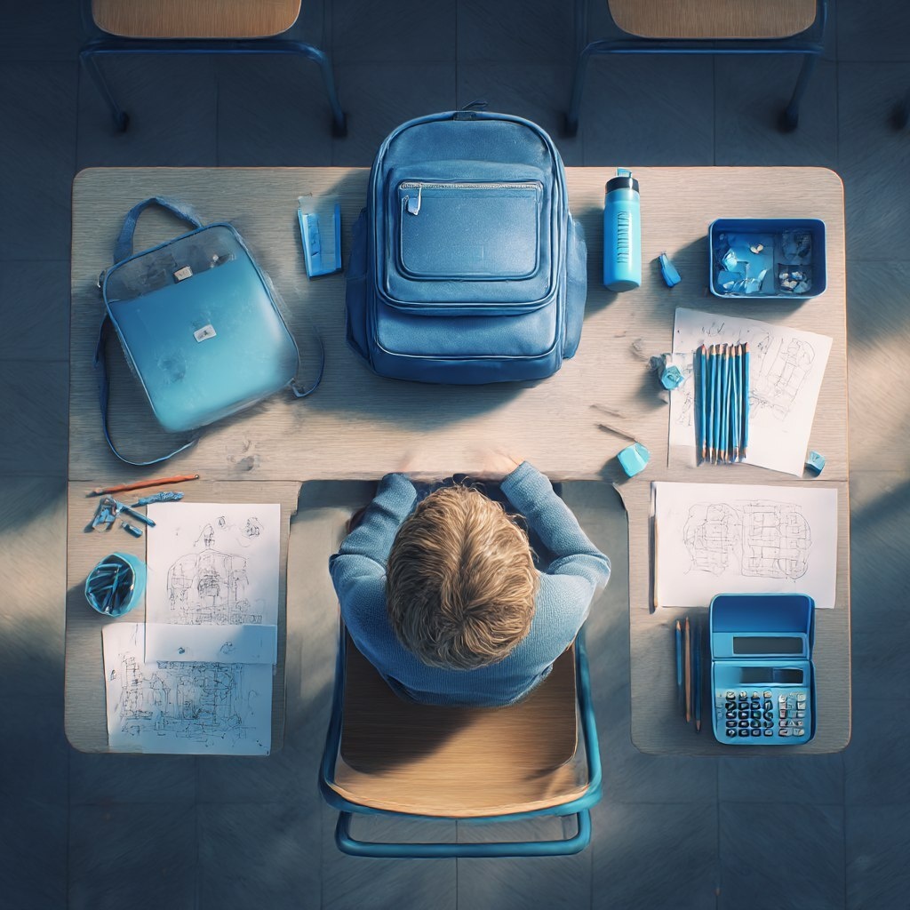 Создано на основе запроса: Top view of a school kid in a class room, sitting on a chair, a blue schoolbag on top of the table, matching