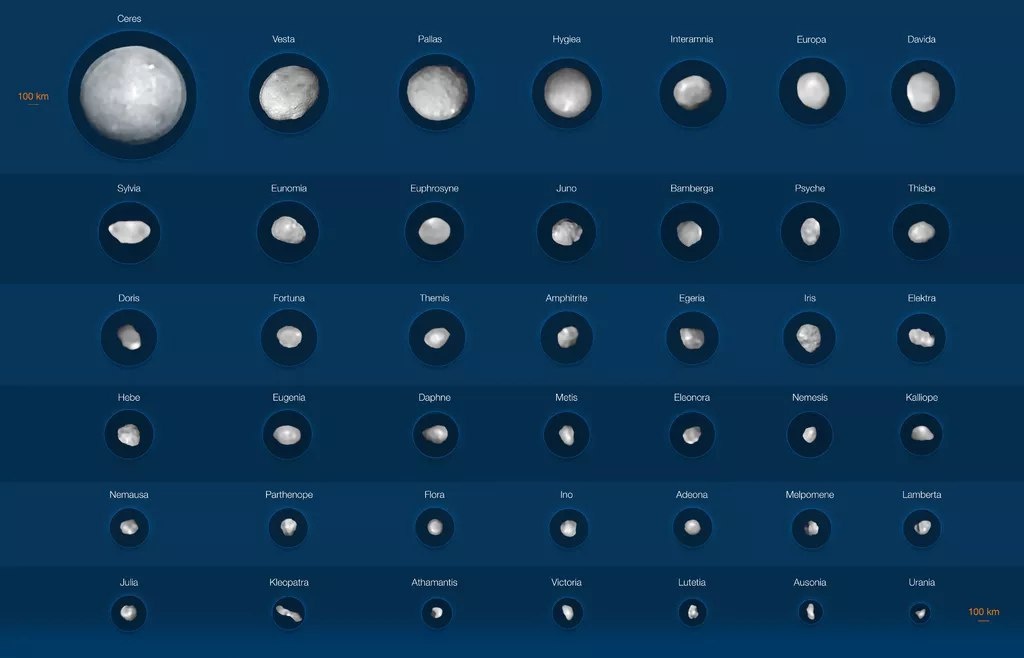 Знакомьтесь - крупнейшие обитатели пояса астероидов: 42 тела, преимущественно размером более 100 км.