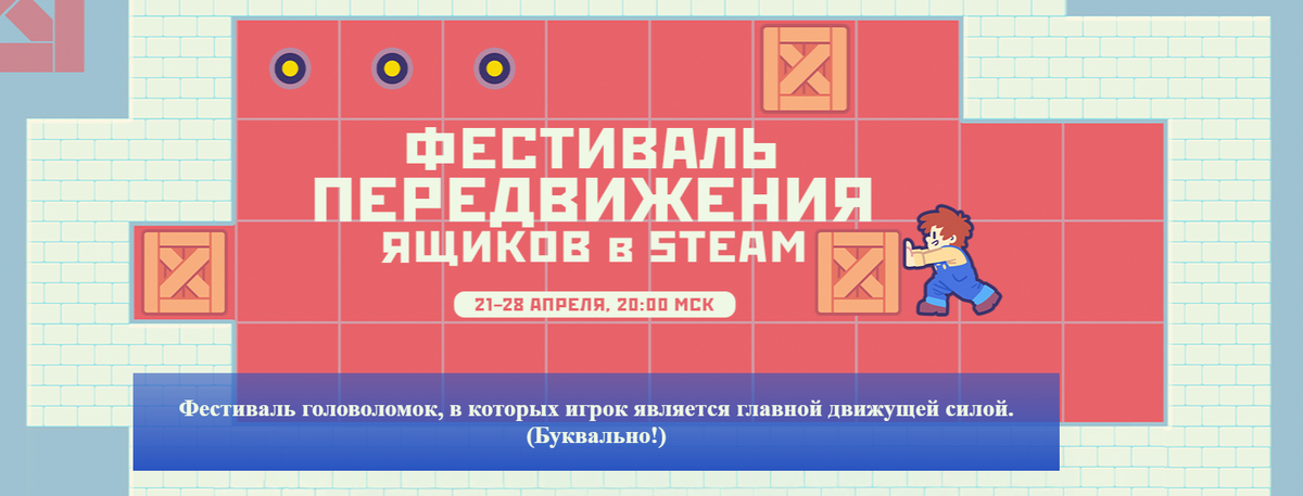 Фестиваль передвижения ящиков Фестиваль логических игр-головоломок продлится до 28 апреля. В магазине можно урвать множество игр с большими скидками Ну и конечно же не забудьте получить халявные рамку, аватар и стикер распродажи Заходите на главную страницу Steam, жмите кнопку получить и подтвердите "бесплатную" покупку