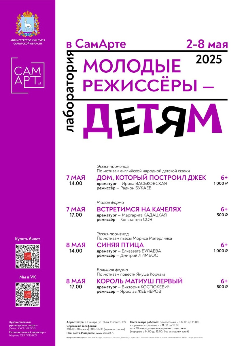 МОЛОДЫЕ РЕЖИССЕРЫ — ДЕТЯМ Мы приготовили для вас кое-что совершенно особенное! СамАрт открывает двери в творческую лабораторию, где молодые и талантливые режиссеры представляют свои смелые идеи для детского театра! Вас ждёт то, чего вы еще точно не видели на нашей сцене... и не только сцене. Эскизы-бродилки: 🟪 «Дом, который построил Джек» | 6+ Режиссер Радион Букаев Драматург Ирина Васьковская 7 мая | 14:00 Купить билеты 🟪 «Синяя птица» | 6+ Режиссер Дмитрий Лимбос Драматург Елизавета Булаева 8 мая | 14:00 Купить билеты Обратите внимание: количество мест на эскизы-бродилки ограничено! Малая форма: 🟪 «Встретимся на качелях» | 6+ Режиссер Константин Соя Драматург Маргарита Кадацкая 7 мая | 17:00 Купить билеты Большая форма: 🟪 «Король Матиуш Первый» | 6+ Режиссер Ярослав Жевнеров Драматург Виктория Костюкевич 8 мая | 17:00 Купить билеты Станьте первыми, кто увидит, каким может быть театр для детей завтра! Ждем вас в СамАрте!