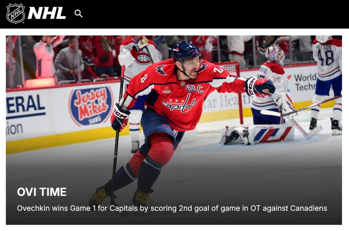 Капитан «Вашингтон Кэпиталз» Александр Овечкин забил два гола – в том числе победный в дополнительное время – и сделал результативную передачу в первом матче серии первого раунда Кубка Стэнли против «Монреаль Канадиенс» (3:2 ОТ, 1-0).