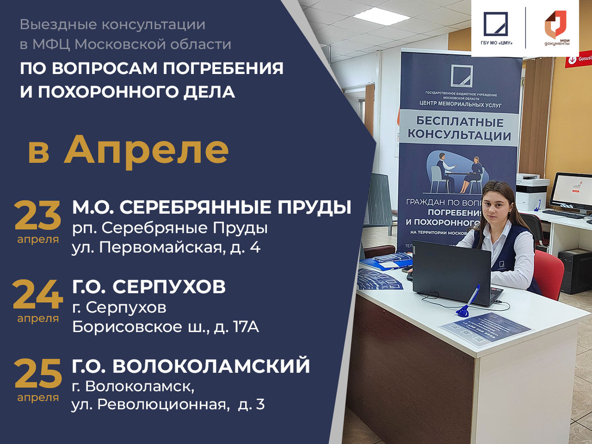 Специалисты ГБУ МО «Центр мемориальных услуг» отвечают на вопросы населения о погребении и похоронном деле в МФЦ Московской области Спешите получить консультацию в МФЦ вашего города, согласно графику выездов, от специалистов ГБУ МО «Центр мемориальных услуг». Если вы хотите узнать о законодательстве в сфере погребения и похоронного дела - приходите в МФЦ на консультацию. Наши специалисты ответят на все интересующие вас вопросы. 23.04. - МФЦ, Московская обл., м.о. Серебрянные Пруды,