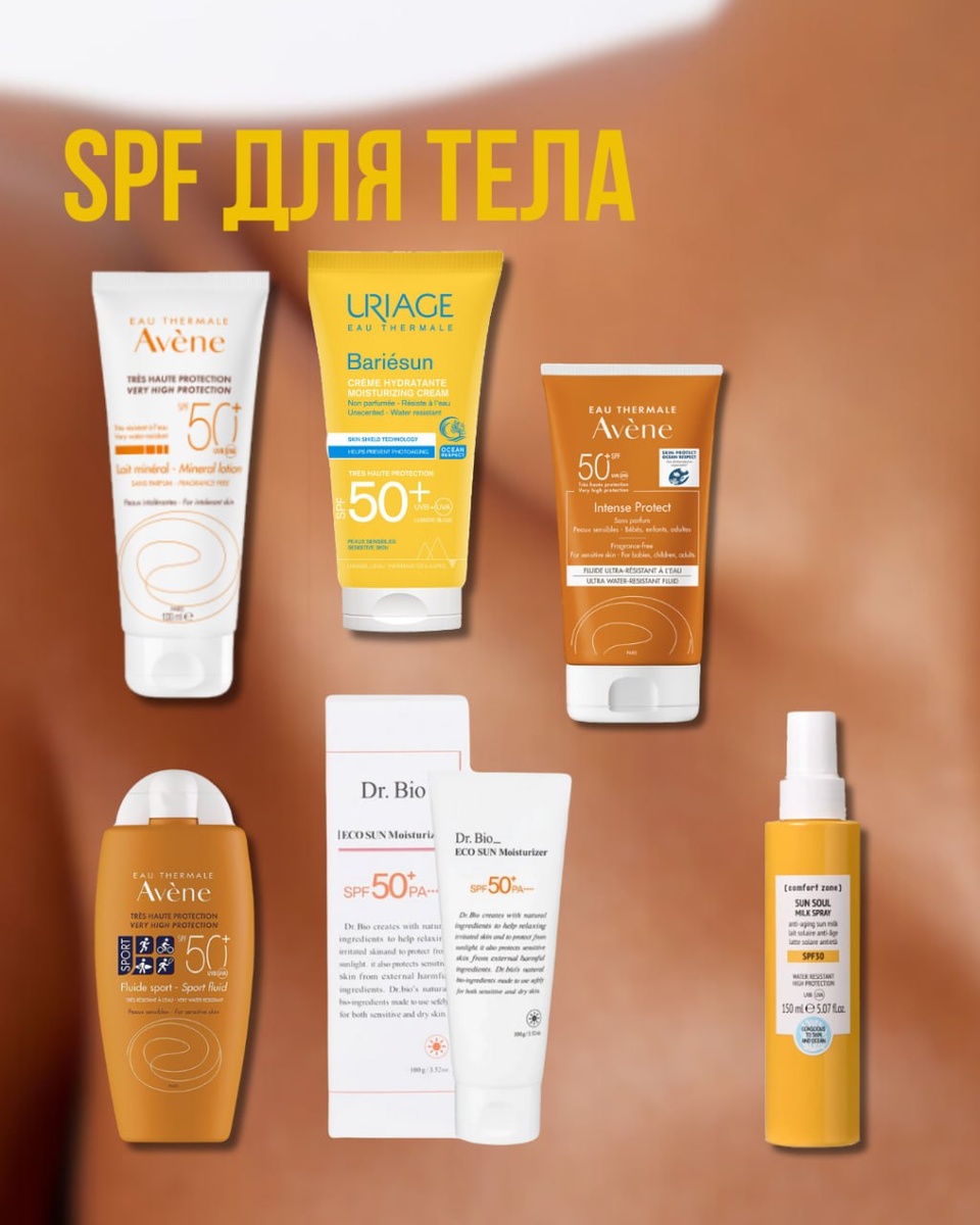 SPF ДЛЯ ТЕЛА ☀️ Лично я солнцезащитные баночки для лица использую и на тело, т.к. их у меня столько, что за всю жизнь не истратить) А для вас я подобрала санскрины для тела с хорошими составами и в больших объемах: — EAU THERMALE AVENE Mineral Lotion. Тут физический фильтр - диоксид титана, 100 мл, ~ 2000 ₽ — Uriage BARIESUN. 3 современных химфильтра и один старый, 50 мл, ~ 1500 ₽ — Avene EAU THERMALE AVENE INTENCE Protect, на современных химфильтрах, 150 мл, ~ 2000 ₽ —Avene EAU THERMALE AVENE Sport, на смеси старых и новых фильтров, 100 мл, ~ 1800 ₽ — Dr. Bio SPF50 SUN Moisturizer, современные фильтры, 100 мл, ~ 2100 ₽ — Comfort zone SUN SOUL MILK SPRAY, 150 мл, ~ 4300 ₽ #подборки