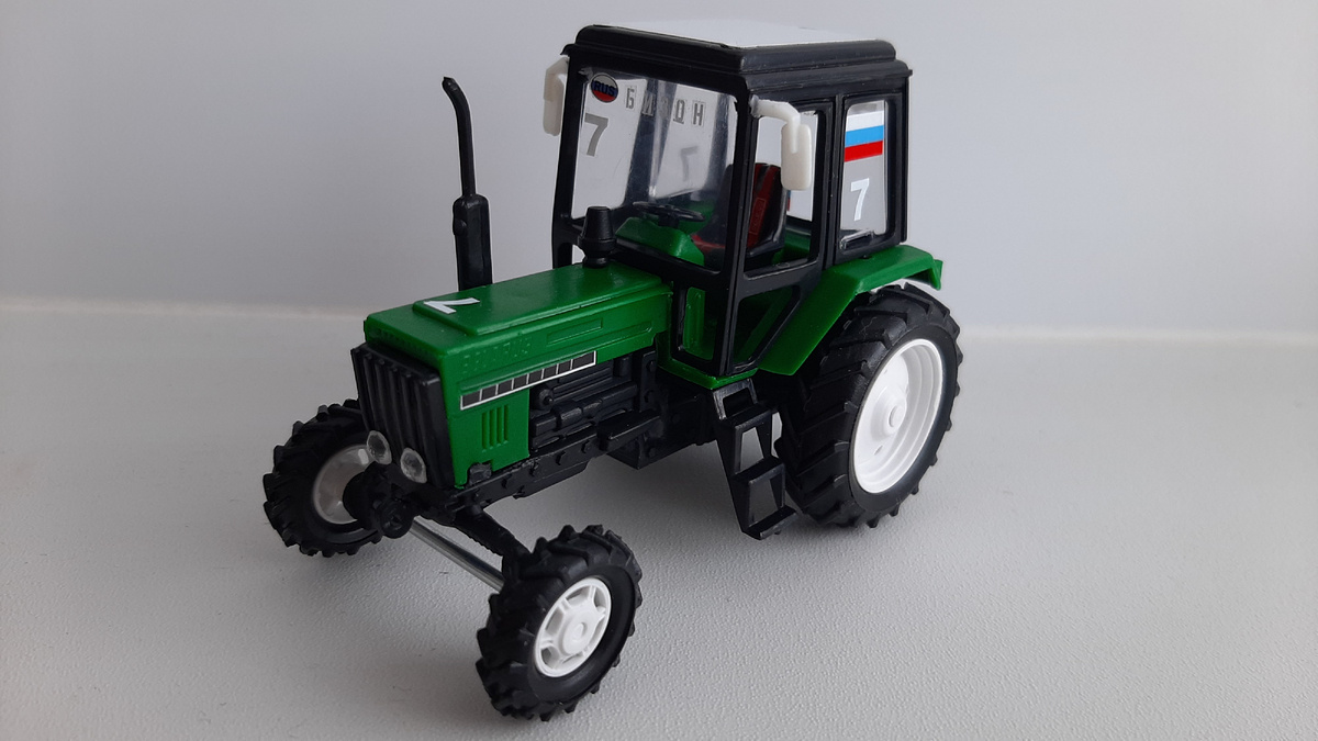 Добрый вечер, уважаемые подписчики! Ну вот, кажется, настал момент, когда я размещаю на канале статью. Хочется надеяться, что вам будет интересно. Сегодня хочу представить вашему вниманию свою очередную модель-конверсию: трактор "Беларусь" для ростовских гонок "Бизон". В основе конверсии - обычный пластиковый трактор МТЗ. Конкретного прототипа нет. Делал нечто среднее. Конечно, не обошлось без доработок. Во-первых, была установлена другая оптика ( фары от компаньоновского Газона). Передние фары трактора были перенесены на облицовку радиатора - "экспортный вариант", так сказать. Во-вторых, были установлены зеркала от элеконовского КамАЗа. Они сразу оживили модель. Ещё одна маленькая доработочка - установка спереди буксирной проушины (сцепного устройства). Конечно, не обошлось без декалей: ну куда же без них. Так трактор выглядит с разных ракурсов: Спасибо за внимание! Всем - здоровья!