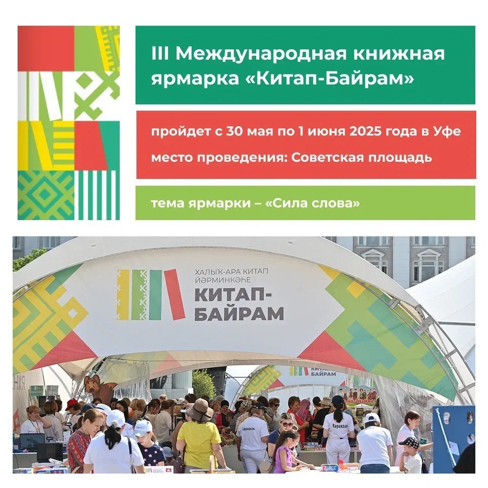 С 30 мая по 1 июня в Уфе состоится III Международная книжная ярмарка «КИТАП-БАЙРАМ». Для участия в форуме зарегистрировались более 100 участников из России и ближнего зарубежья. Главной темой ярмарки станет «Сила слова». Первый день форума будет посвящен Великой Отечественной войне и пройдет под девизом «Слово о подвиге». Девиз 31 мая – «Слово о вечном», день посвящен классической литературе. 1 июня в честь Дня защиты детей темой станет «Слово о будущем». Для гостей праздника выступит Детский сводный хор Республики Башкортостан – 600 детей исполнят песни в честь 80-летия Великой Победы! Все дни фестиваля будут работать тематические площадки, специальные зоны для детей и молодежи. Смотрите карточки.