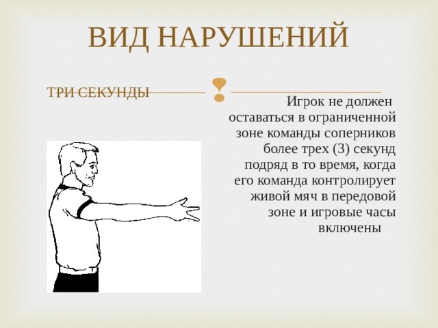 Правило трех секунд гласит, что игрок атакующей команды не может находиться в ограниченной зоне (трехсекундной зоне) соперника более трех последовательных секунд, пока его команда владеет мячом в зоне нападения.