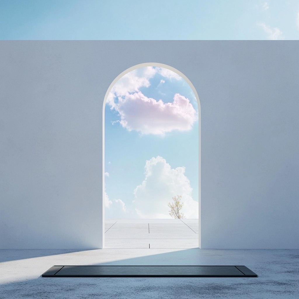Создано на основе запроса: gate without door with sky inside the wall, wall is clean, minimalist looks