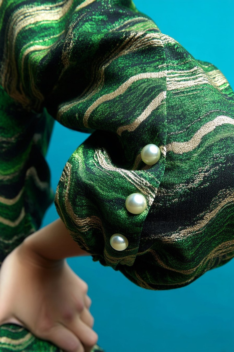 Создано на основе запроса: Close-up shot of a blouse with an abstract Loch ness monster pattern in green and beige, featuring large puffed