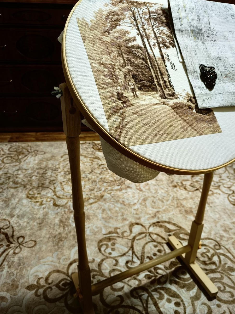 А вот и еще один мой буковый помощник, станок-пяльцы Elbesее HFST18 🥰👏 Выполнены из цельной древесины, угол наклона регулируется, диаметр 48 см и как раз в рабочую зону убирается половина работы! Так как я люблю вышивать исключительно с барабанной упругой натяжкой, этот вариант пялец для меня просто идеален 😍👏👏👏 Теперь у меня мини-коллекция из пялец данной английской марки, настольные пяльцы ещё успела купить четыре года назад, искала что-то на них похожее и вот результат поисков - напольный станок для квилтинга 🤫🧵🪡 Но и для вышивки крестом подошёл безупречно 🍃 Также следом выложу видеообзор для наглядности. А теперь немного подробнее о них: Пяльцы Elbesee HFST18 — это напольный станок для квилтинга и вышивания, предназначенный для комфортной работы с крупными проектами. Вот основные характеристики и особенности этой модели: Лично мною не найдено. Пяльцы Elbesee HFST18 — это не просто инструмент, а надежный помощник для тех, кто ценит комфорт и качество в творчестве. Прове