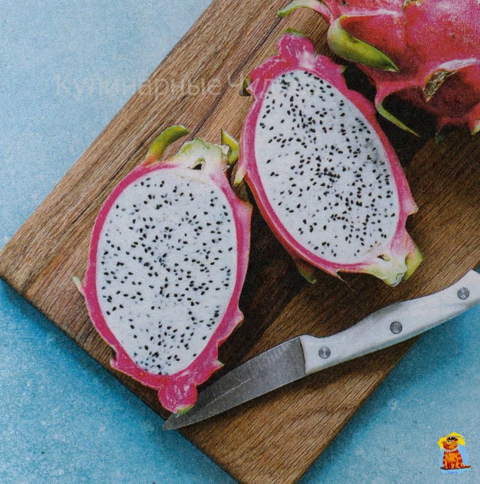 Питахайя имеет множество названий: драгонфрукт, питайя, драконий фрукт. Этот экзотический фрукт ярко-розового цвета представляет собой необычную форму похожую на чешуйки дракона. Внутри питахайи белая мякоть с чёрными точечками. По вкусу мякоть напоминает одновременно киви и арбуз, запах нейтральный, сладкий. Интересный факт, что плод драконьего фрукта - определенный вид кактусов, они похожи на лианы, произрастающие в Южной Америке. Питахайя содержит в составе много антиоксидантов, имеет высокое содержание витамина С, железа и магния. Благодаря фрукту нормализуется холестерин, хорошо помогает пищеварению, снижает развитие сердечных заболеваний, улучшает настроение за счёт фруктозы. Чтобы попробовать питахайю сначала вымойте её, затем разрежьте вдоль на половинки. Мякоть можно вынуть с помощью столовой ложки или сделайте 2 разреза, чтобы получились четвертинки, а кожуру срежьте ножом. Идеи приготовления драконьего фрукта: 1. Мякоть нарежьте кубиками и подавайте к столу в качестве десер
