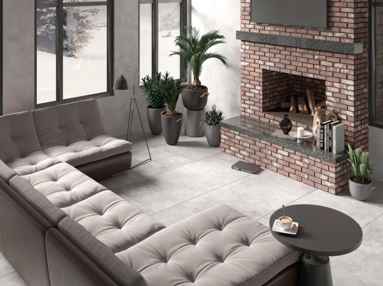 При создании трендового интерьера подойдет керамическая плитка для гостиной, которая имитирует не только рисунок, но и текстуру природных материалов: дерева, металла, мрамора, травертина или другого камня. Также популярны в 2025 году поверхности с текстурой, похожей на бетон. Шероховатые рельефные стены и пол выглядят респектабельно, приятны на ощупь и гораздо безопаснее глянцевого кафеля — это важный нюанс для тех, кто не знает, какую напольную плитку стоит купить.