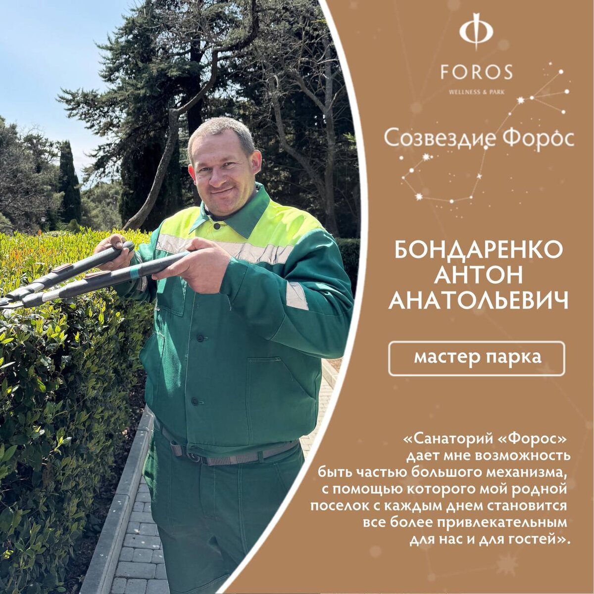 👋Знакомьтесь! Бондаренко Антон Анатольевич – мастер парка. 💫Профессиональный багаж В санатории «Форос» работает с 2016 года, из них большую часть находился на должности старшего матроса спасателя, последние 5 лет в Отделе паркового хозяйства. Профессиональный путь строился вокруг любимого посёлка Форос, где Антон Анатольевич успел поработать в различных сферах деятельности. Антон Анатольевич гордится тем, что приносит неоценимый вклад в развитие любимого парка. 💫Немного из личного Вне работы любит проводить время на природе: рыбалка, походы в горы, тихая охота за грибами. 💫 Взгляд со стороны Антон — настоящий профессионал, чьё искреннее увлечение своим делом не может не восхищать. Вся его жизнь связана с любимым посёлком Форос, что делает его работу особенно значимой. Его труд в Форосском парке — это больше, чем просто выполнение обязанностей. Это любовь, вложенная в каждое дерево и дорожку, желание сохранить и развивать место, которое так дорого ему с детства. Поддержим