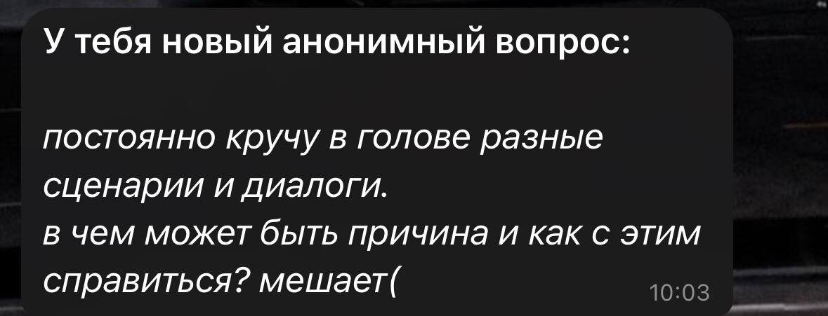 #рубрикавопросы #ответыПолина Привет! Понимаю, что постоянное прокручивание сценариев и диалогов может действительно быть трудно переносимым и мешать жить. Это явление часто называется избыточным руминенированием или пережевыванием мыслей. Причинами могут быть: - стресс - перфекционизм - неопределенные эмоции С кем диалоги? Какие ситуации? Это повторяющиеся сценарии или люди? В любом случае, я бы начинала с осознования своего состояния и добавляла физическую активность и отдых! и начала бы открываться и делиться своим мыслями или с психологом или с близкими людьми 💔 Обнимаю! 🫶🏻 ссылка на анонимный бот