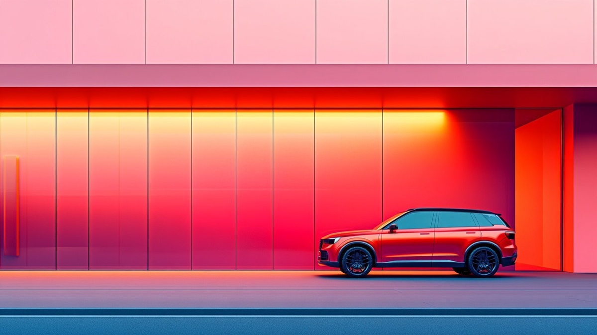 Создано на основе запроса: A photorealistic image of a modern shop and modern commercial car, with gradient colors, bright red colors
