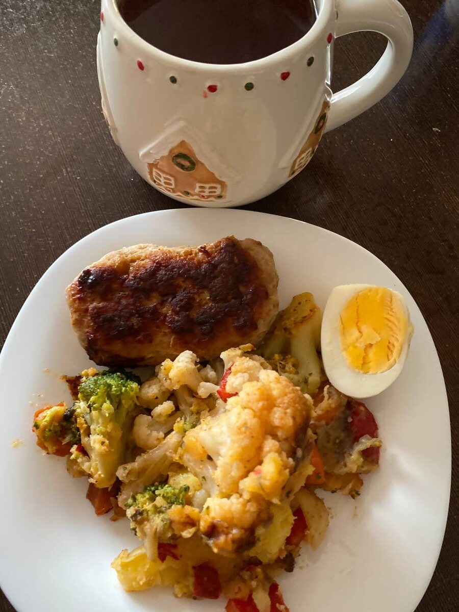 Ужин:овощи, котлетка куриная, пол яйца и черный чай без сахара 👌А что у вас сегодня на ужин