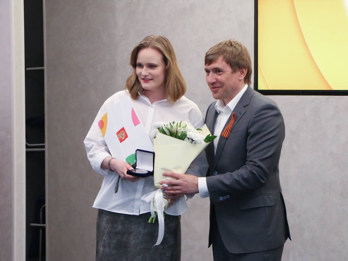 Глава Росмолодежи наградил корреспондента ГТРК "Иртыш" Елену Беляеву памятной медалью Президента России