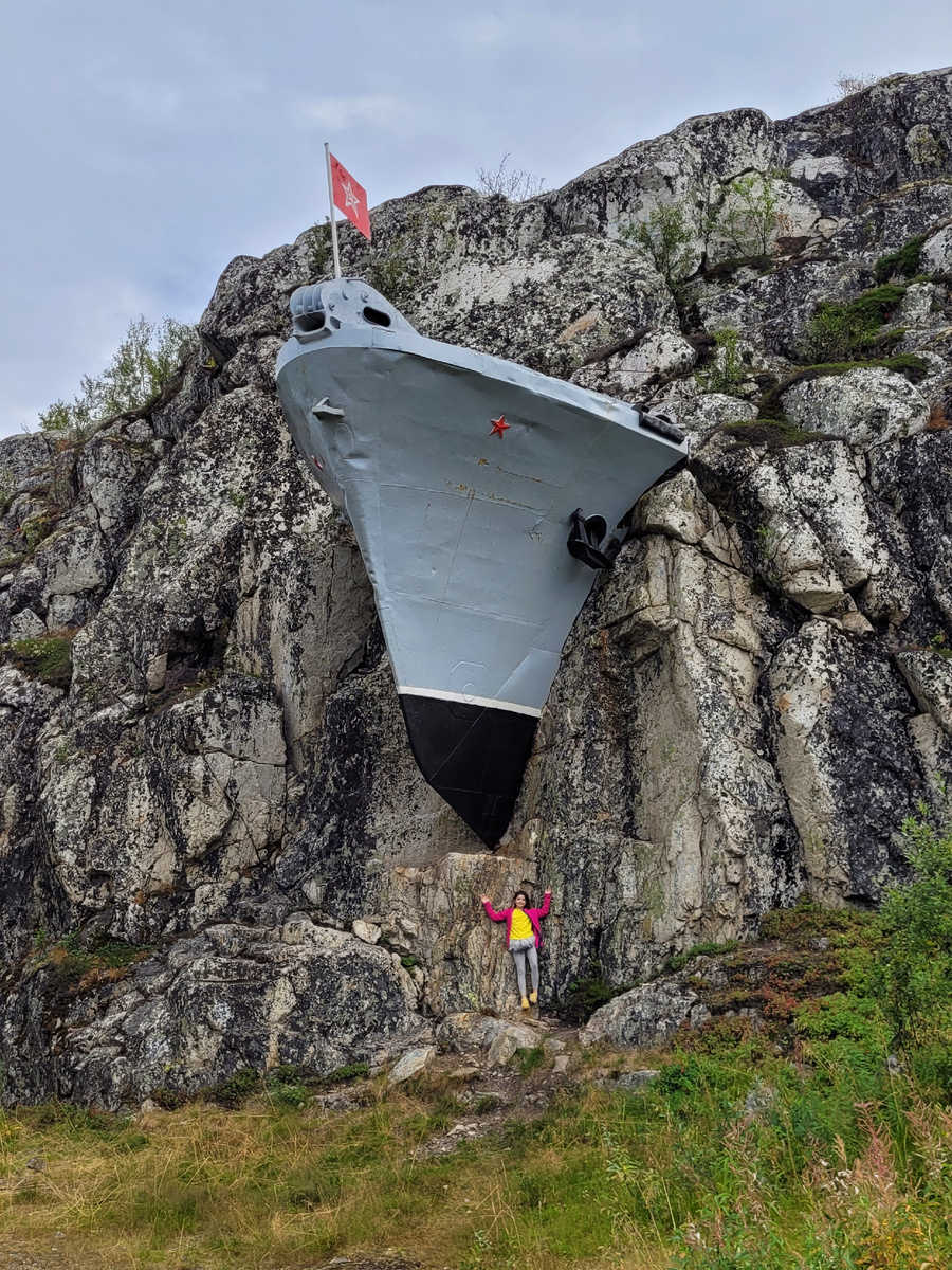 Дороги в этом направлении пустые. Машин мало (можно сказать что практически нет). В основном 51 регион. Населенных пунктов мало. Те что попадаются- военные городки. Возникает ощущение, что въезжаешь в какую-то запретную зону. Ближе к Лиинахамари, машины перестали встречаться. Едем одни. Куда едем, зачем….погода портится. Пасмурно. Вот показался нос корабля, выплывающего из скалы. Делаем остановку.