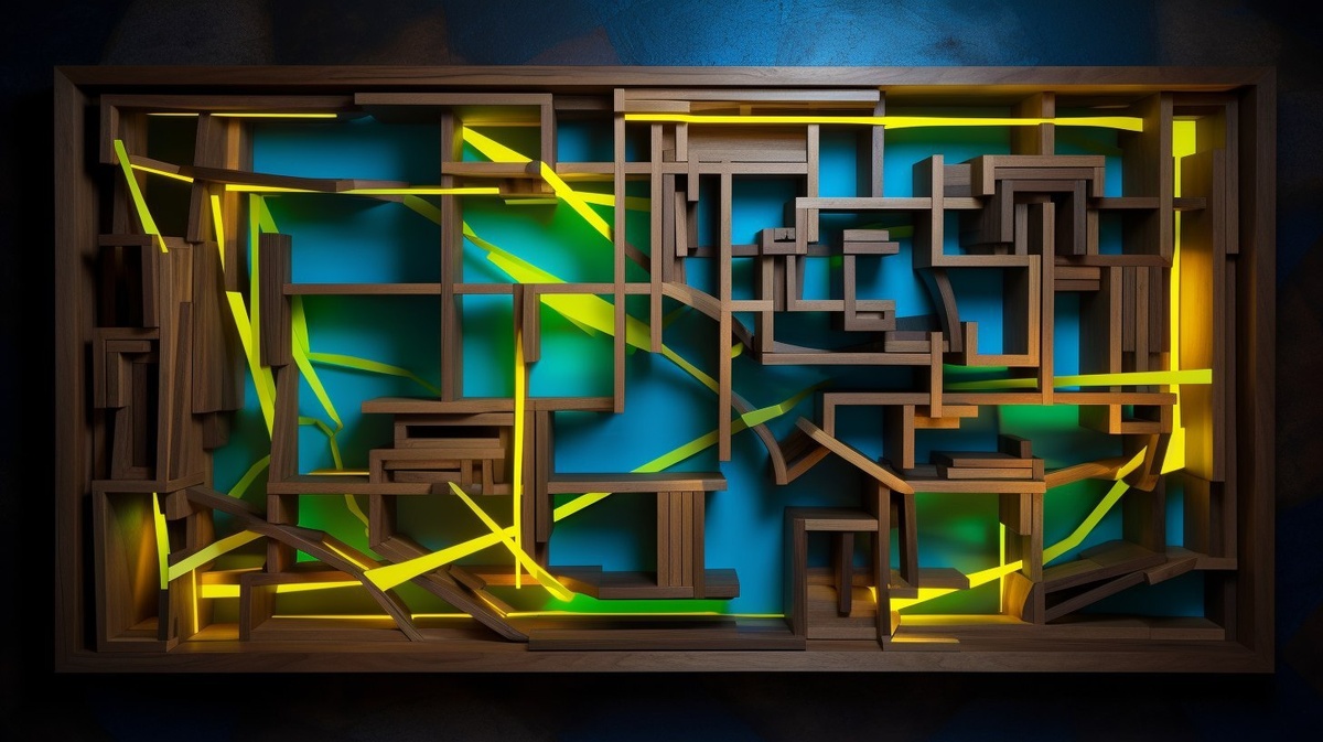 Создано на основе запроса: an abstract geometric composition of wood and light, floating glowing lines and mathematical formulas intertwining with the wood, an organic digital space where handcraft meets technology, colors: midnight blue, electric turquoise-blue, and lemon-lime yellow, glowing neon accents and diffused lighting --- Автоперевод: абстрактный геометрический состав из дерева и света, плавающие светящиеся линии и математические формулы, переплетающиеся с деревом, органическое цифровое пространство, где ручное, оно встречается с технологиями, цветами: голубые, электрические бирюзовые голубы Хорошо выглядит? 🤔 https://dzen.ru/id/65c0c65c86e4f837c27b24d7 #ИИ #AI #нейросеть #midjourney #art