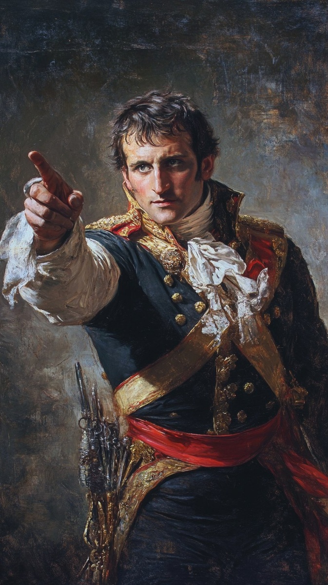 Создано на основе запроса: Napoleon Bonaparte striking a dramatic pose as if for a selfie, 18th-century military uniform, camera flash effect, classic oil painting style with modern social media twist, humorous but regal tone, vertical format --- Автоперевод: Наполеон Бонапарт, поразительный драматическую позу, как будто для селфи, военной формы 18-го века, эффекта флэш-камеры, классического стиля живописи масла с современным поворотом в социальных сетях, юмористический, но царственный тон, вертикальный формат Как тебе иллюстрация? 🤔 https://dzen.ru/id/65c0c65c86e4f837c27b24d7 #ИИ #AI #нейросеть #midjourney #art