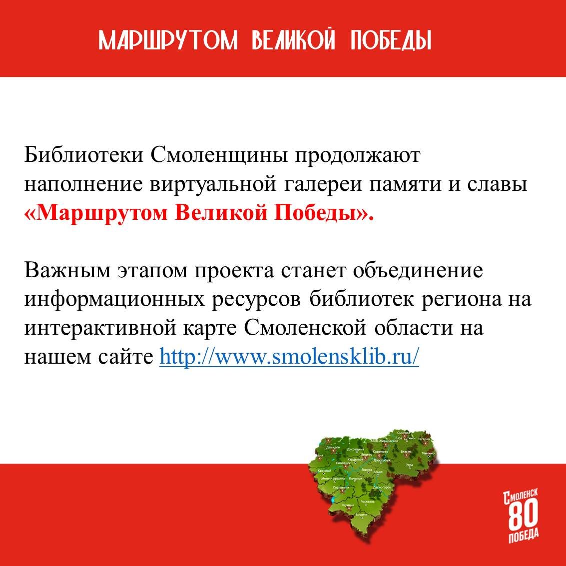 Областная библиотека им. А.Т. Твардовского продолжает реализацию проекта «Создание виртуальных галерей памяти и славы "Маршрутом Великой Победы"». В нем участвуют муниципальные библиотеки Смоленской области – создают на своих официальных сайтах виртуальные галереи на основе методики построения музейных экспозиций. Вы также можете присылать свои видеоролики, посвященные Великой Победе, в муниципальные библиотеки. Важным этапом проекта станет объединение информационных ресурсов библиотек региона на интерактивной карте Смоленской области на нашем сайте Справки по телефону 38-30-21.