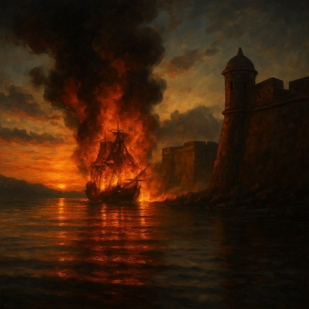 (Июль 1669 года. Штурм форта Сан-Карлос) Рассвет застал флот Моргана в неестественной тишине. Даже чайки замолчали — будто предчувствовали, что вода станет зеркалом для двух видов огня: Старый галеон, едва державшийся на воде, был превращён в смертельную машину. Его начинка: — Поджигайте, когда ветер сменится, — приказал Генри, поправляя треуголку, пробитую пулей под Гибралтаром. Рядом Мария «Коготь» перекрестилась — непривычный жест для женщины, чьи ногти, казалось, могли вспороть бочонок. Когда «Последний шанс» вспыхнул, Кто-то на берегу двигался в дыму — силуэт, возможно, девочки... Возможно, просто один из раненных. Время было не для фантазий. Взрыв раскроил утро пополам. Над бухтой повис грохот, будто сама земля треснула. Сквозь дым и огонь, словно сквозь пропитанную порохом ткань, флот Моргана рвался к выходу из озера: Жан-Лу «Безгубый» орал непристойную песню, волоча ящик с захваченным испанским серебром к пушке — в спешке он заряжал ядра, не разбирая, что под руку попадётс