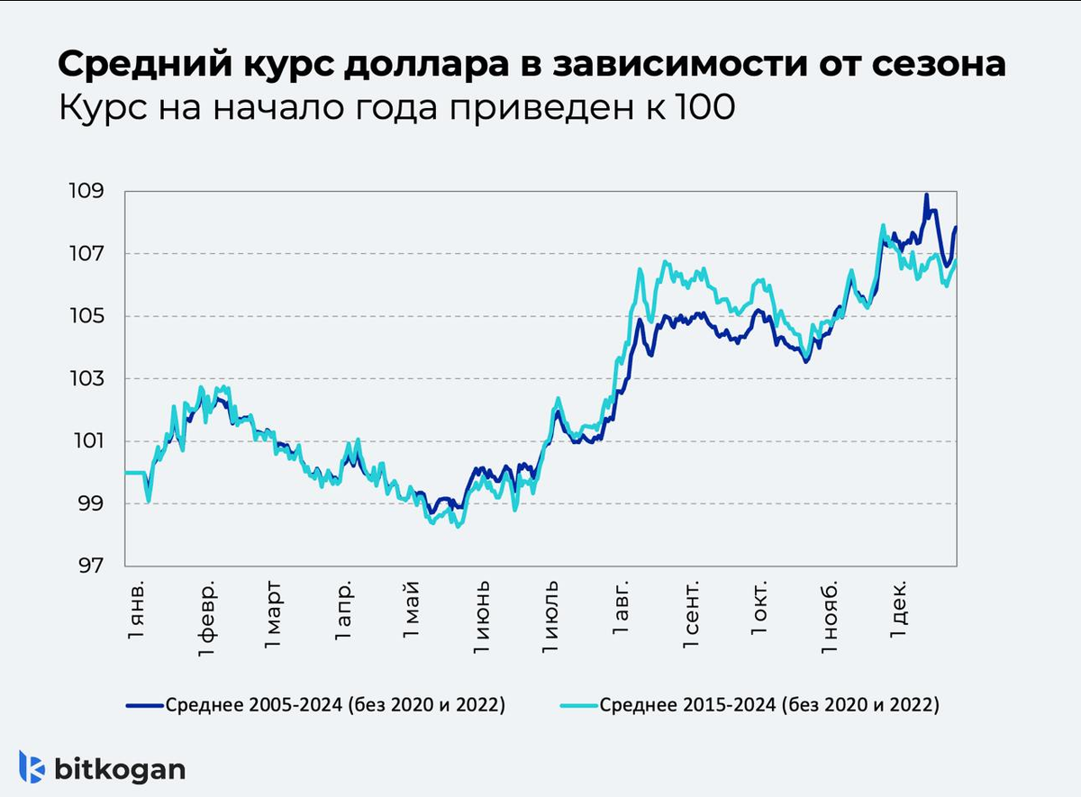 Нефть все дешевеет, а рубль упорно дорожает. Кажется, что привычная картина мира рушится. Но на самом деле, несмотря на нефть, торговый баланс России в феврале и в марте увеличивался из-за сокращения импорта. Соответственно, спрос на валюту со стороны импортеров был не слишком большим. Плюс продажи валюты от ЦБ. ➡️ В итоге продавцов валюты было больше, чем покупателей, что закономерно привело к снижению курса доллара и юаня. Хорошо, причины укрепления рубля выяснили. Но гораздо интереснее понять, сколько это будет продолжаться? Ведь импортеры в какой-то момент таки придут за валютой. Вопрос – когда? Кое-какие предположения на этот счет можно сделать, опираясь на историческую сезонность курса доллара к рублю. Она не просто есть, а может дать вполне конкретные намеки. Если взглянуть на усредненный график динамики курса доллара к рублю за последние 10 или 20 лет, то мы увидим, что весна традиционно является периодом укрепления рубля. Даже экстремальные 2020-й и 2022-й годы вписываются в о