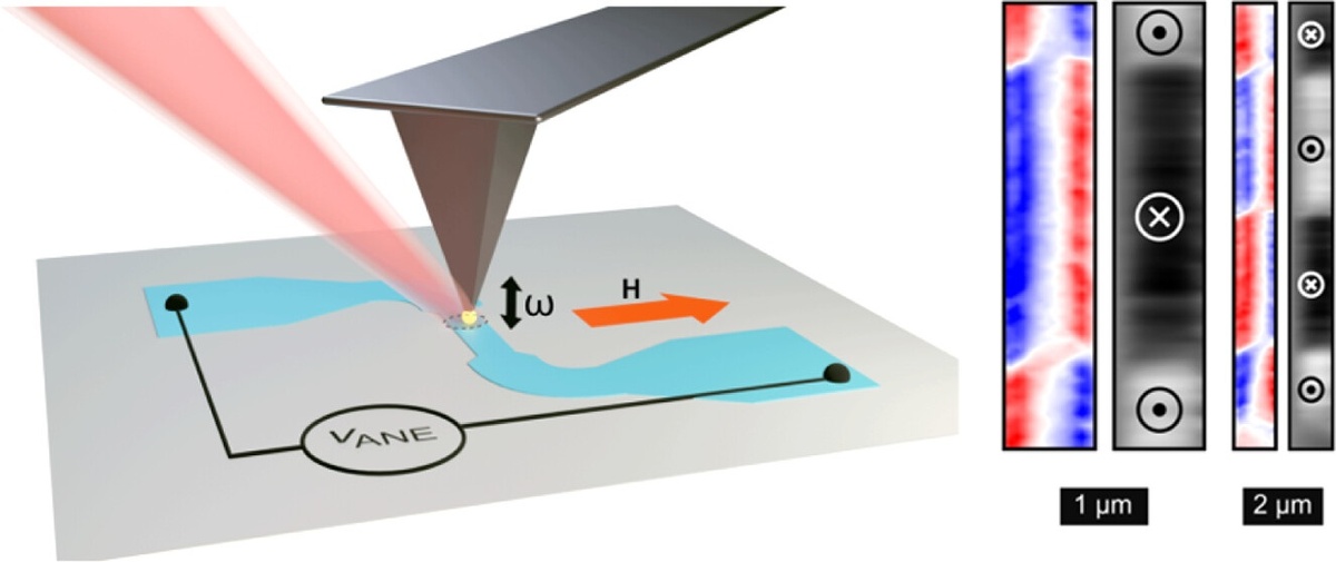 (Результаты: вещество. «ХиЖ» 2025 №3) Разрешение оптических микроскопов ограничено длиной волны видимого света и составляет около половины микрометра. Однако современная наука и технологии требуют изучения все более мелкомасштабных явлений. Для этого обычно используют электронные микроскопы и микроскопы атомных сил. Все они имеют многочисленные разновидности, специализированные для работы в определенных режимах и с определенными материалами. Одну из таких модификаций предложила научная группа профессора физики Георга Вольтерсдорфа (Georg Woltersdorf) из Университета Мартина Лютера. Разработанный прибор предназначен для изучения магнитных структур на поверхности магнитных металлов с разрешением в десятки нанометров, то есть на порядок меньше оптического. В основе нового типа атомно-силового микроскопа лежит аномальный эффект Нернста. Он состоит в том, что в неравномерно нагретых металлах, помещенных в магнитное поле, возникает электрическое напряжение, перпендикулярное и их намагниченно