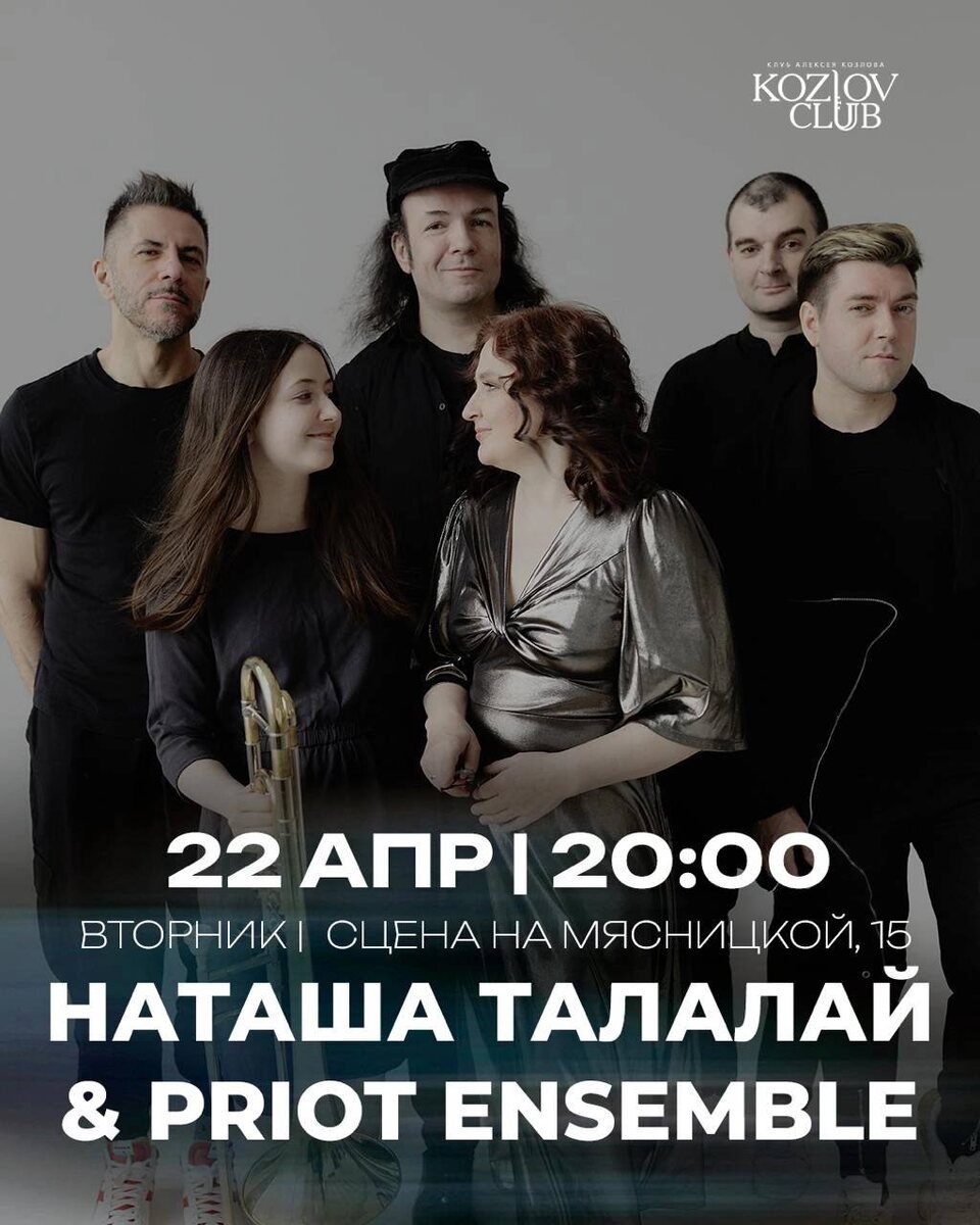 Ансамбль Прёт, руководимый мною и певицей и моей супругой Наташей, выступит сегодня в Клубе Козлова на Мясницкой; это «новая сцена», отдельное место в Lion’s Head Pub, не перепутайте с основным зданием! Вы услышите наш «большой» состав — секстет, в котором играют одни из моих самых любимых музыкантов Москвы: пианист Антон Баронин, саксофонист Анатолий Осипов, контрабасист Денис Шушков, а также наша доча Алиса Талалай на тромбоне! В принципе, когда я вижу эти имена, мне становится абсолютно всё равно, что именно играть с ними, ибо огромное удовольствие от взаимодействия обеспечено. Но с нами ещё и волшебная музыка Наташи, цепляющая ритмическое внимание во всех правильных местах, глубокая, уводящая за собой, а для меня ещё и ценная тем, что родственная многим любимым мною вещам из мира электроники и танцевальной музыки. Сегодня в восемь вечера! Ждём вас. https://kozlovclub.ru/event/natasha-talalaj-priot-ensemble-2