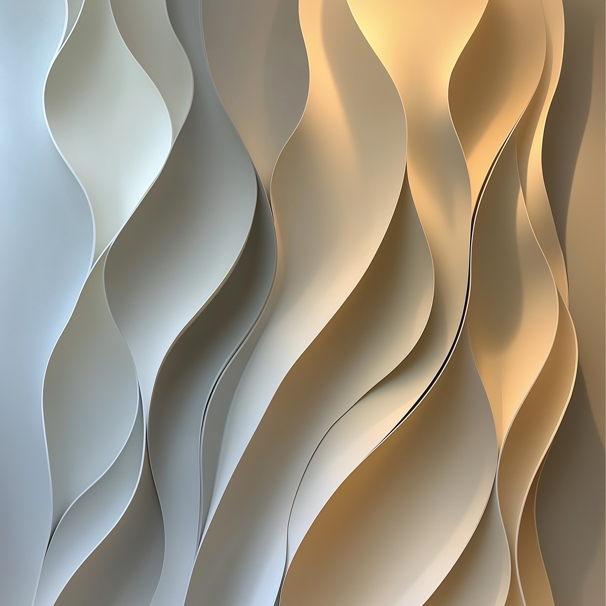 Создано на основе запроса: smooth parametric wave wall sculpture, elegant paper-layered folds, flowing vertical wave panels, soft beige and