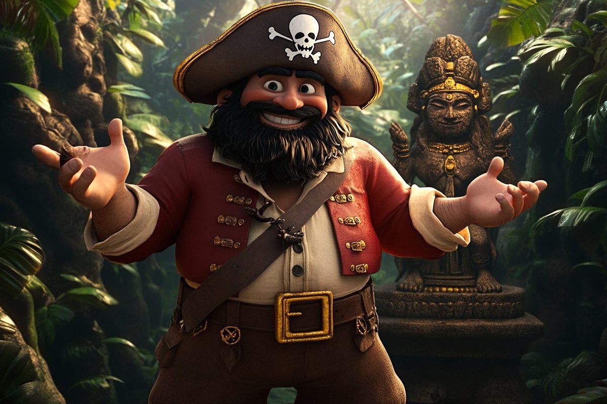 Создано на основе запроса: a smiling Pirate with a skull and crossbones on his hat stands in a dense, dark jungle., gesturing with his