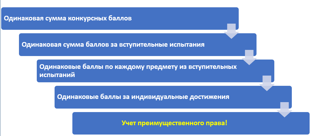То, есть если возникает вопрос равенства определенных условий у поступающего в части равенства конкурсных баллов, суммы баллов за вступительные испытаний, баллов по каждому предмету, за индивидуальные достижения, только в этом случае учитывается преимущественное право зачисления! Подробнее об этом в одной из следующих публикаций.